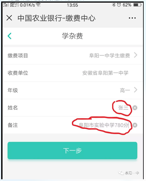 1、打开微信扫一扫,扫描(或长按识别)下方二维码进入农行缴费页面,先在“姓名”栏输入本人姓名(与学籍保持一致),再在“备注栏”输入“初中毕业学校+中考分数”(如:阜阳市实验中学780分),如下图: