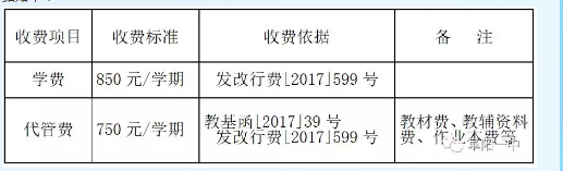 高一新生2018年秋季学期收费金额1600元整,其中:学费850元;代管费750元,依据如下:
